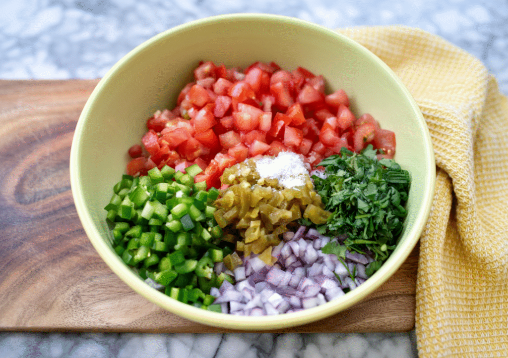 - Finely dice tomatoes, onion, jalapeño, and cilantro.
