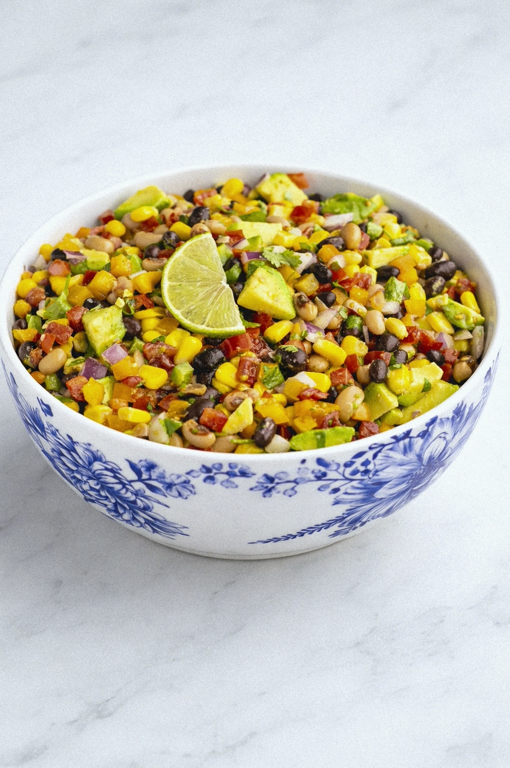 - Combine black beans, black-eyed peas, corn, diced vegetables, dressed avocado, and cilantro in a large bowl.