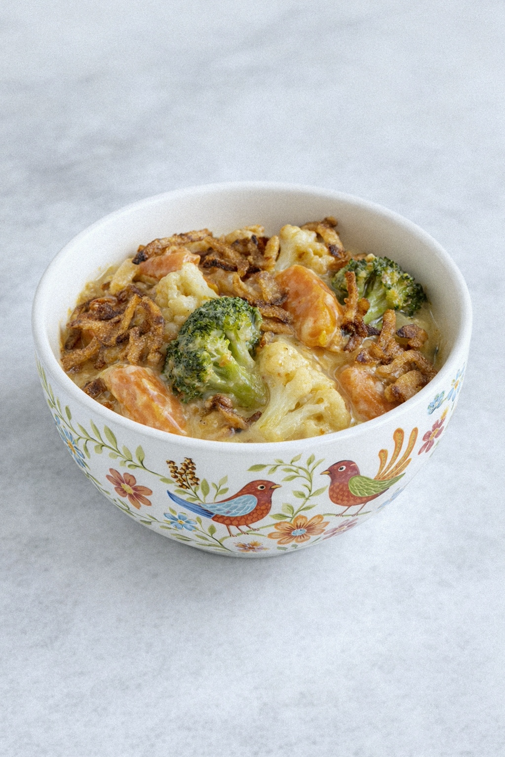 Remove from the oven and sprinkle the crispy fried onions evenly on top.