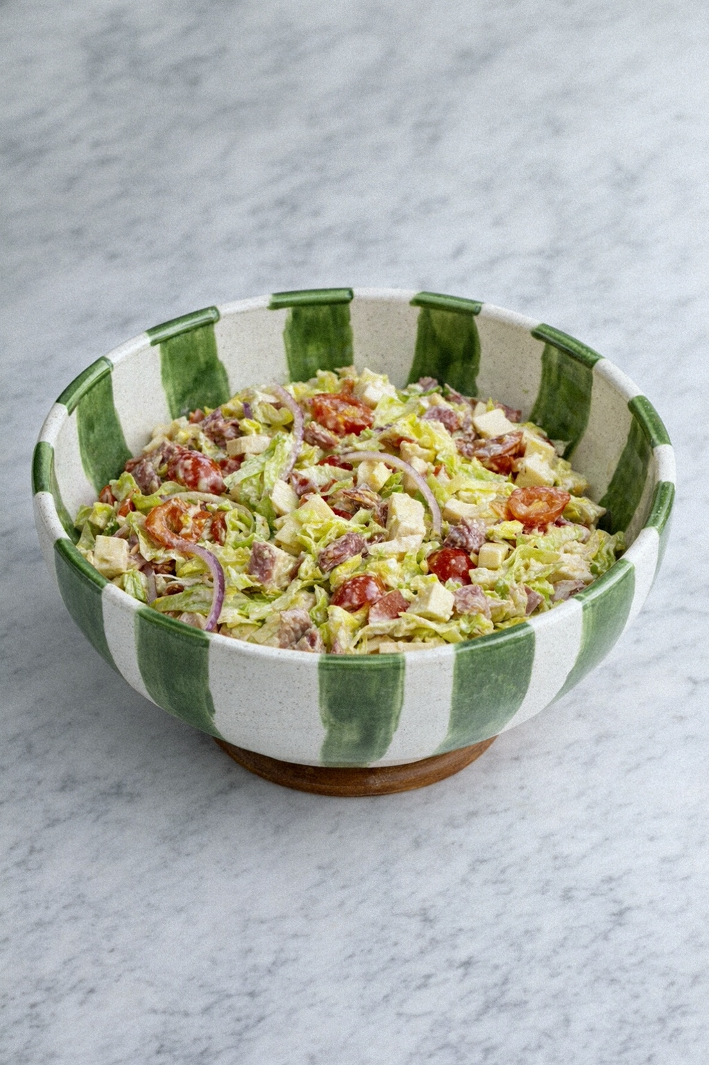 - Combine lettuce, red onion, tomatoes, banana peppers, chopped meat, chopped cheese, and parmesan in a large bowl. Toss to mix.