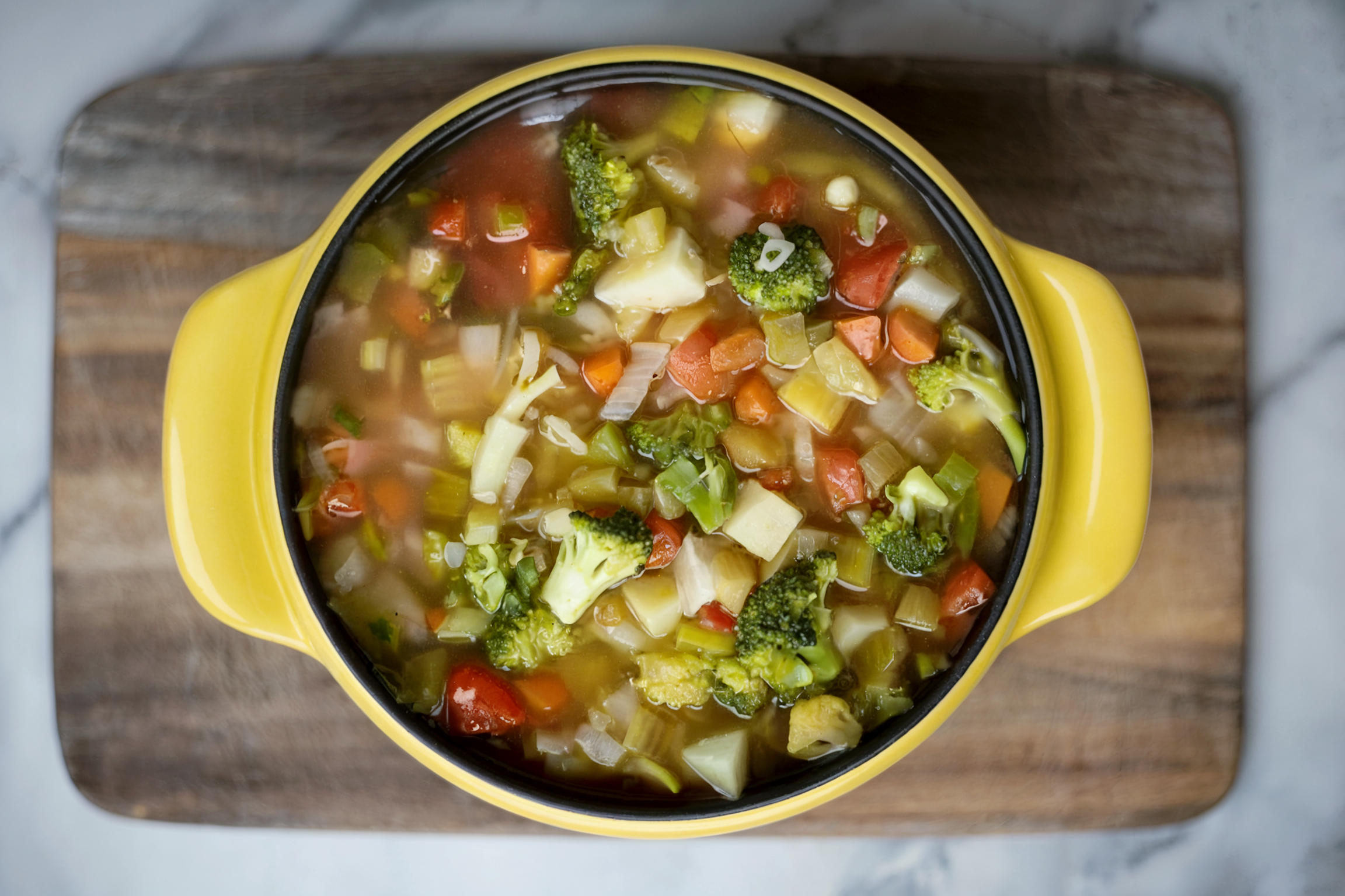 Stir in the diced bell pepper and broccoli florets. Let the soup continue to simmer for another ~7-10 minutes. The soup is ready when the potatoes and rice are tender and the broccoli is still a little crisp.