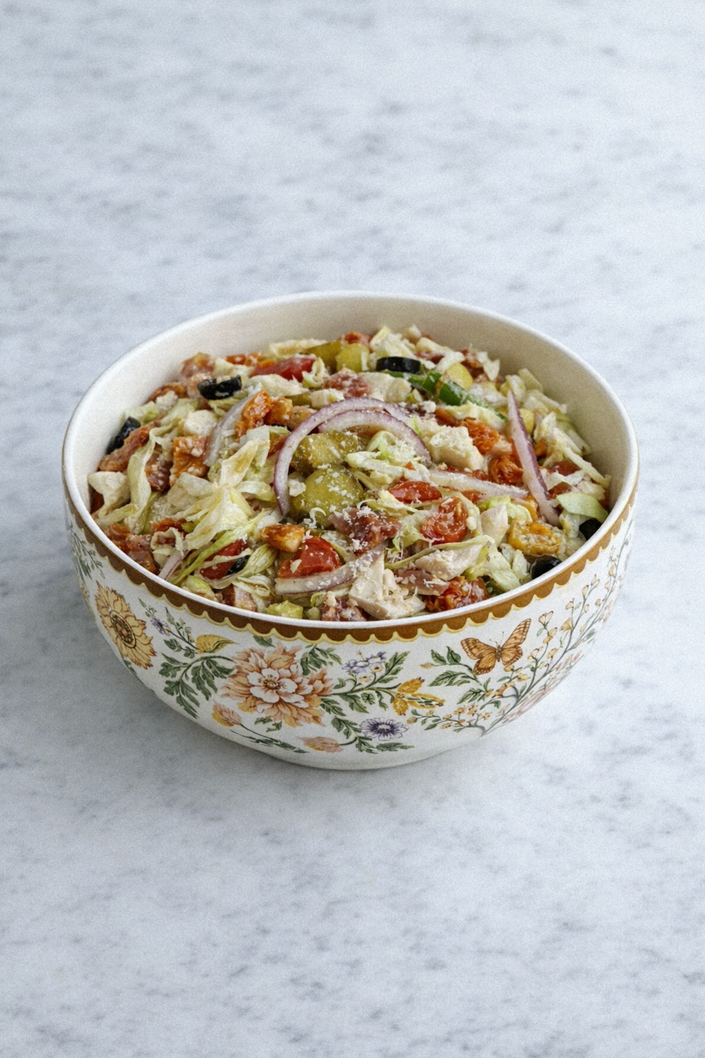 - In a large bowl, combine shredded lettuce, chopped deli meat, chopped cheese, red onion, bell pepper, cherry tomatoes, banana peppers, pickles, black olives, and parmesan cheese.