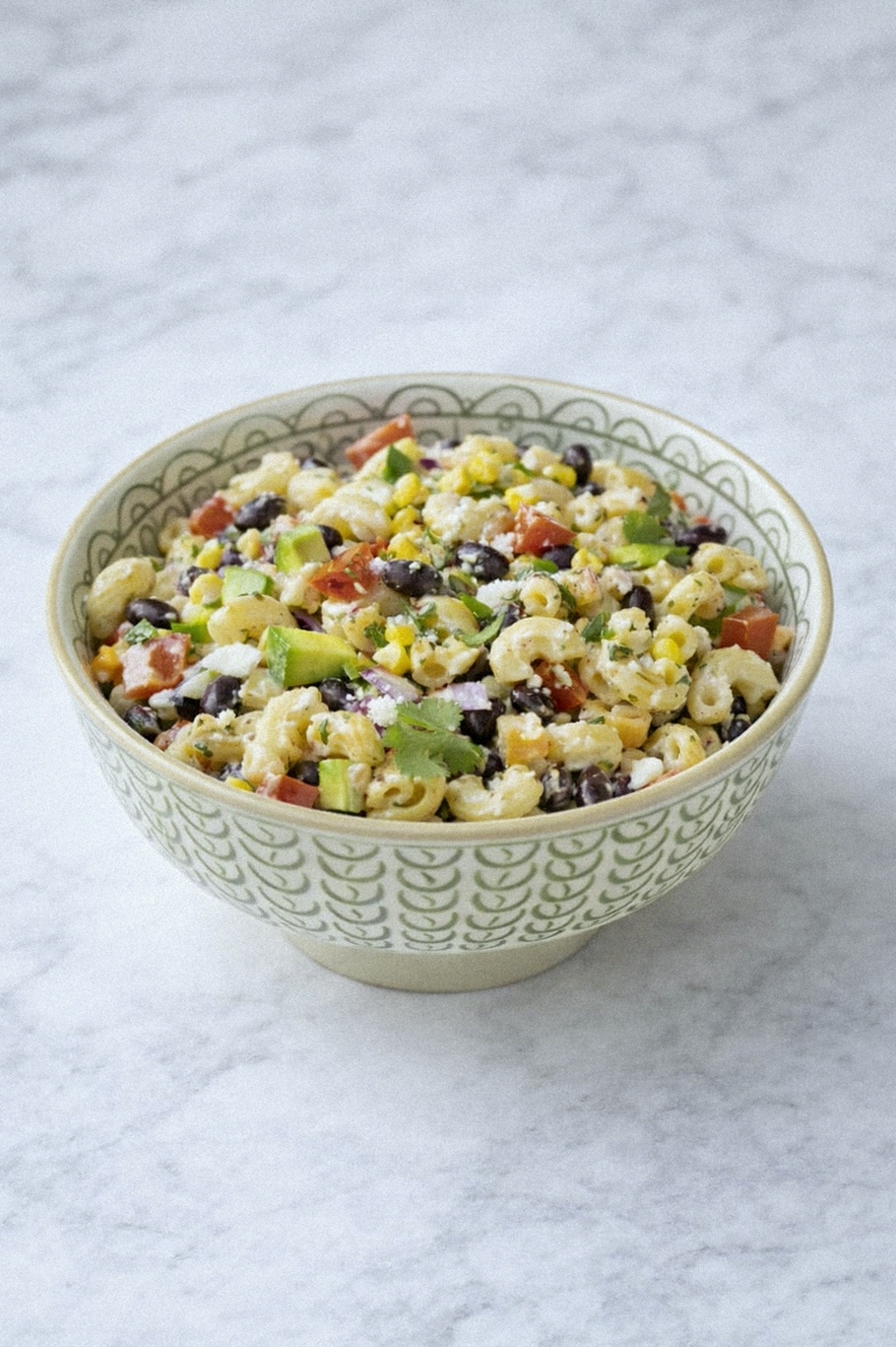 In a large salad bowl, toss together the drained macaroni, most of the corn kernels, tomatoes, black beans, avocado, Cotija cheese, onion, and the cilantro dressing.