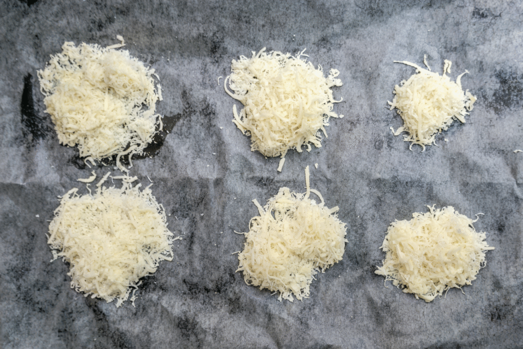 - Place heaping tablespoons of grated Parmesan onto the sheet, lightly patting each mound without flattening completely.