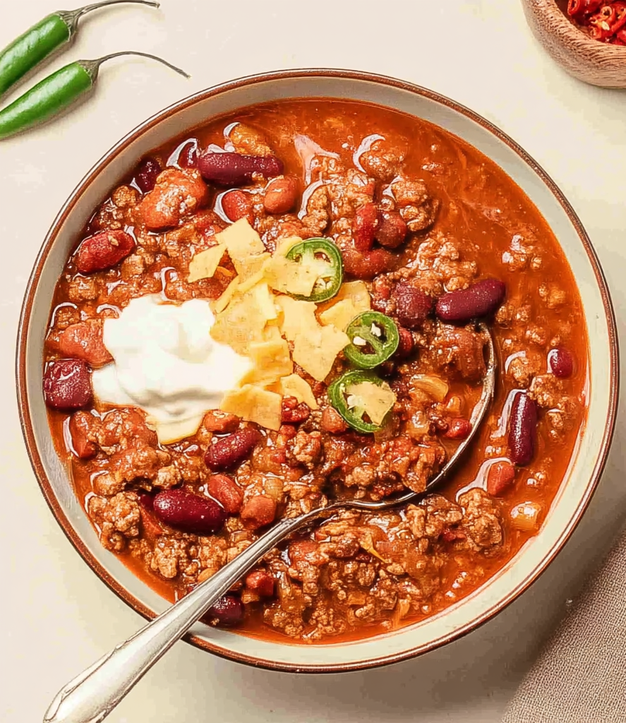 This slow cooker chili is hearty and full of bold, smoky flavor, with tender ground beef, beans, and a rich tomato base seasoned with warm spices. A touch of sugar and green chilis balance the heat, while optional toppings add creamy, cheesy, or spicy flair.
