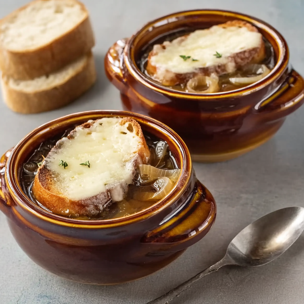 - Ladle soup into oven-safe bowls, top with cheeses and croutons; bake at 500°F until bubbly (5-7 min).