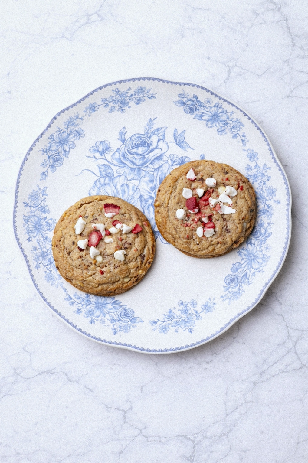 - Remove from oven and immediately press additional white chocolate chips and crushed strawberries on tops.