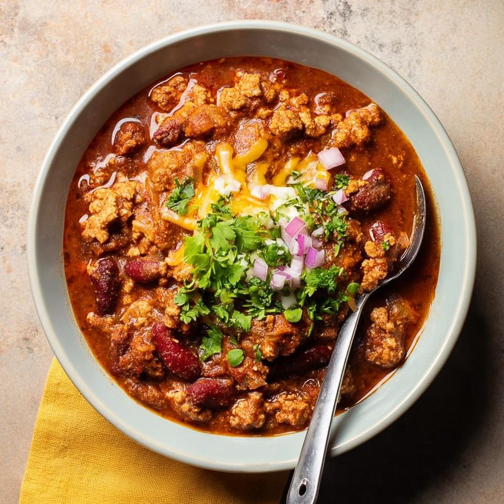 Corn tortillas add depth and help thicken the chili. Suggested garnishes include shredded cheese, sour cream, avocado, chopped onion, cilantro, and pickled or raw chopped jalapeños.